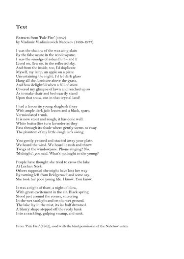 'Pale Fire' is a 1962 work of fiction by Vladimir Nabokov. The plot centres around a poet called John Shade who, shortly before he died, completed a cryptic 999-line poem entitled 'Pale Fire'. In this, he described how his neglect of his teenage daughter led to her death. I have set three extracts from this extraordinary, multi-layered poem, to tell the story of Shade’s daughter. Like Nabokov’s poetry and prose, my setting contains a dark sense of humour, as well as many references and allusions (including quotations from Bach’s St Matthew’s Passion and Mahler’s Second Symphony). Furthermore, as Nabokov’s work is a hybrid between novel and poem, my setting is a hybrid between opera and song. Many thanks to tenor Sam Knock and the RNCM Brand New Orchestra.