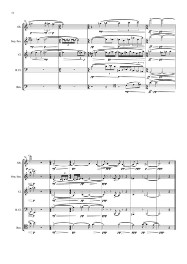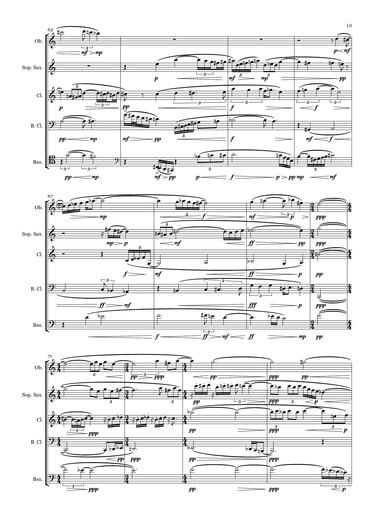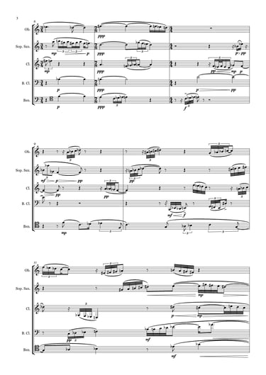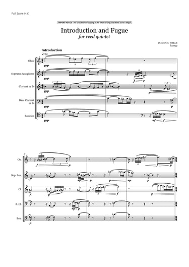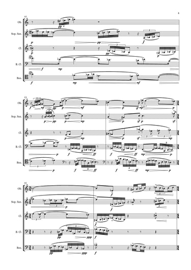 I was approached by the RNCM-based Northern Reeds to write them a piece. Since the reed quintet is a relatively new ensemble, there is not much established repertoire. The repertoire that does exist for this ensemble tends to be light music, often quite minimalist and using the bass clarinet as a ‘riffing’ instrument. Listening to recordings made by the established reed quintet: The Calefax Quintet, I noticed that they played a lot of J.S.Bach arrangements. This encouraged me to write a completely different sort of reed quintet than the existing repertoire that I had come across. I felt that there was potential in this ensemble for diverse individual timbres but an overall homogeneous sound, in a densely contrapuntal work.
