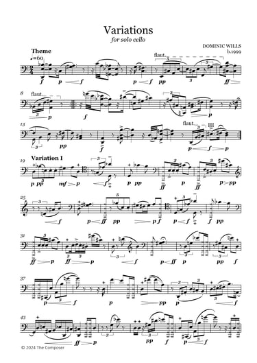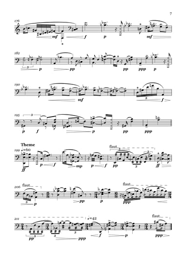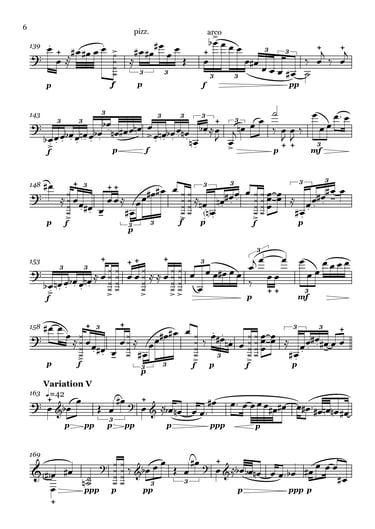 This piece explores a parallel between pre-Romantic Western classical music and Indian classical music. I have chosen to write a theme and variations which self-consciously reflects the structures of 17th and 18th Century works in this form. I try to create tension and excitement, not through movement towards a formal goal, rather through fluctuating levels of complexity, grounded in the same place. This seemed to me to be comparable to techniques used in some Indian classical music. The theme and its subsequent variations are structured, in terms of phrase lengths and shapes, in accordance with a theme and variations from a Mozart violin sonata. This 36-bar repeating form is placed in counterpoint with a 20-bar rhythmic cycle, based on the Rupak Taal, a seven-beat tala, in such a way that the two cycles meet at the end of each variation. The effect is one of eternity and inevitablility. Within the repeating, containing shapes of this work is room for varying levels of complexity, moments of still and moments of wit. This work was commissioned by and is dedicated to Meera Priyanka Raja.