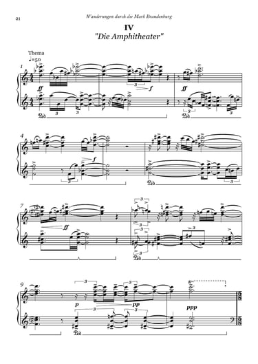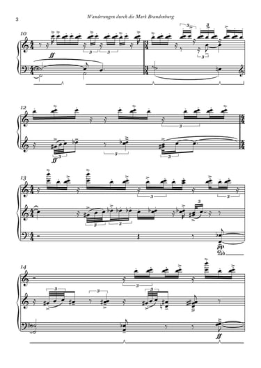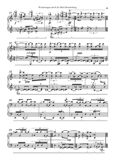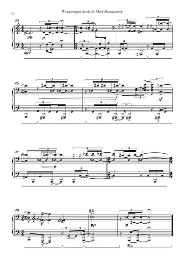 I was particularly touched by Theodor Fontane's beautiful descriptions of his travels through the Brandenburg countryside, after I had spent a very happy summer doing conservation work in the moors and forests there. Back in civilisation, I wrote down my memories of this place in a piano cycle, responding to excerpts from Fontane's text. The key to this work is the theme of memory. The ‘amphitheatres’ of the last movement (the flat, crater-like Brandenburg Ice Age landscape) serve as allusions to the previous movements.